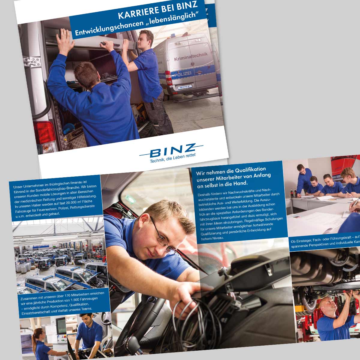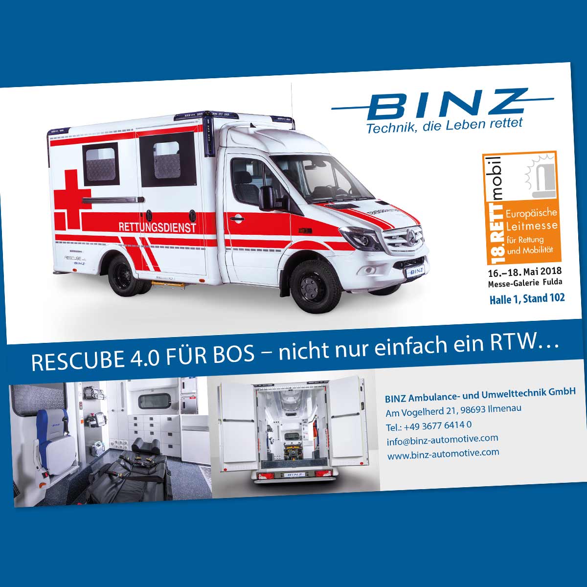 Die BINZ Ambulance- und Umwelttechnik GmbH mit Sitz in Ilmenau / Thüringen ist eines der führenden Unternehmen der Sonderfahrzeugbau-Branche. Die Kunden erhalten innovative Lösungen und Services rund um Rettung und Mobilität für Ambulanz, Feuerwehr, Polizei sowie Mobile Medizintechnik. Engelhardt & Wetzel und das Mediateam Thüringen betreuen BINZ in der Gestaltung von Werbemitteln und im Messebau.