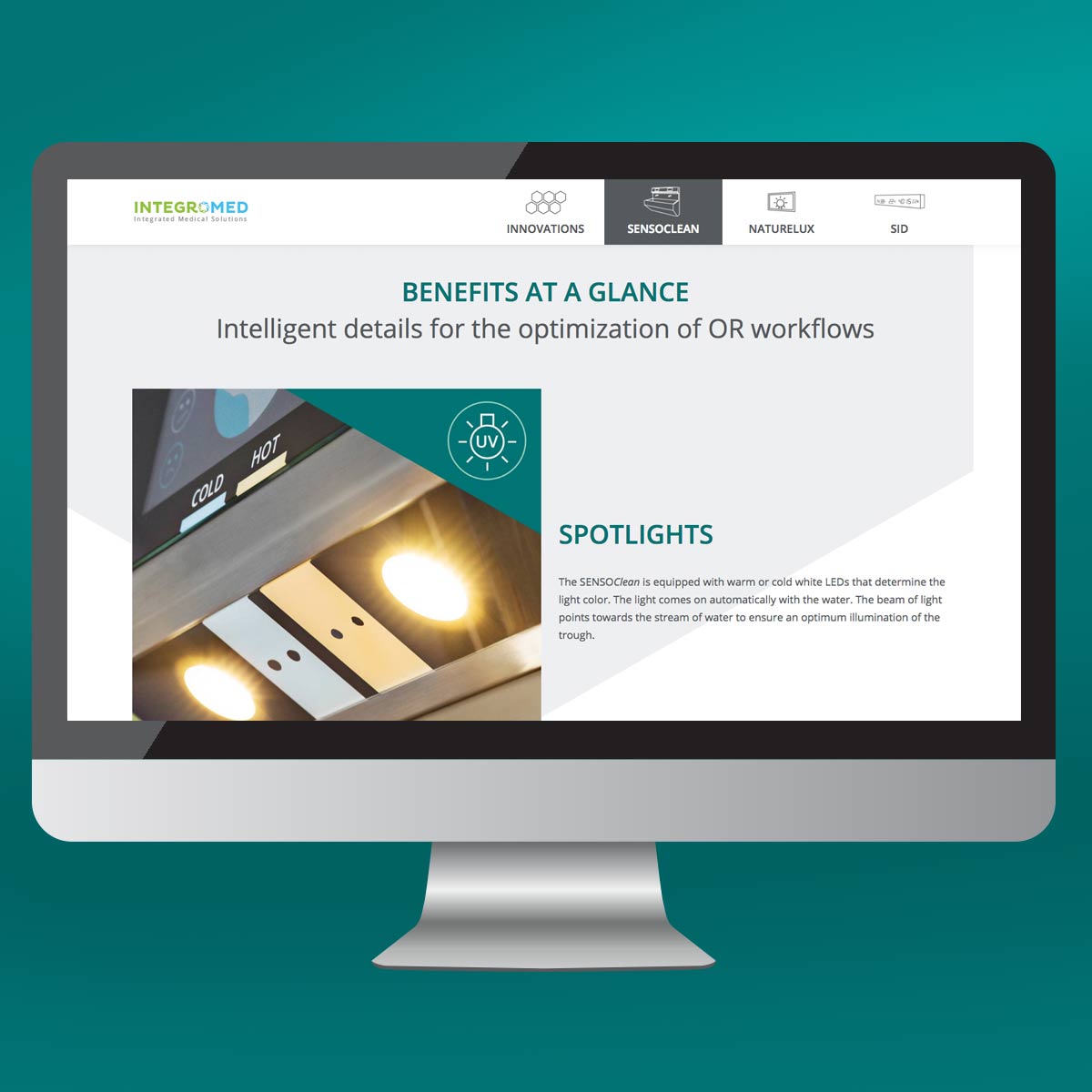 Die Beschreibung fasst die wichtigsten Beweggründe der Integromed GmbH mit Sitz in Leipzig zusammen. Für die aktuellen Innovationen wie beispielsweise den SensoClean, NatureLux oder die IntuitiveConsole gestalteten wir eine moderne Website mit den jeweils wichtigsten Informationen zu den Innovationen: